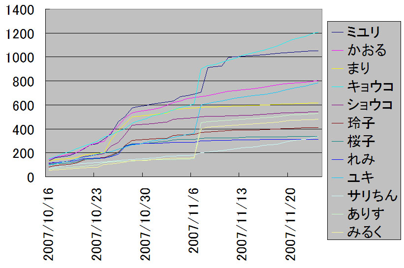 トップのキョウコは、一日の平均得票数18.5票とトップになっており、二位・ミユリとの差を順調に