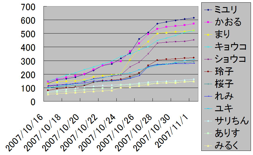 本日は上位のみるくが+3、下位のありすが+1で順位に変動はなし。