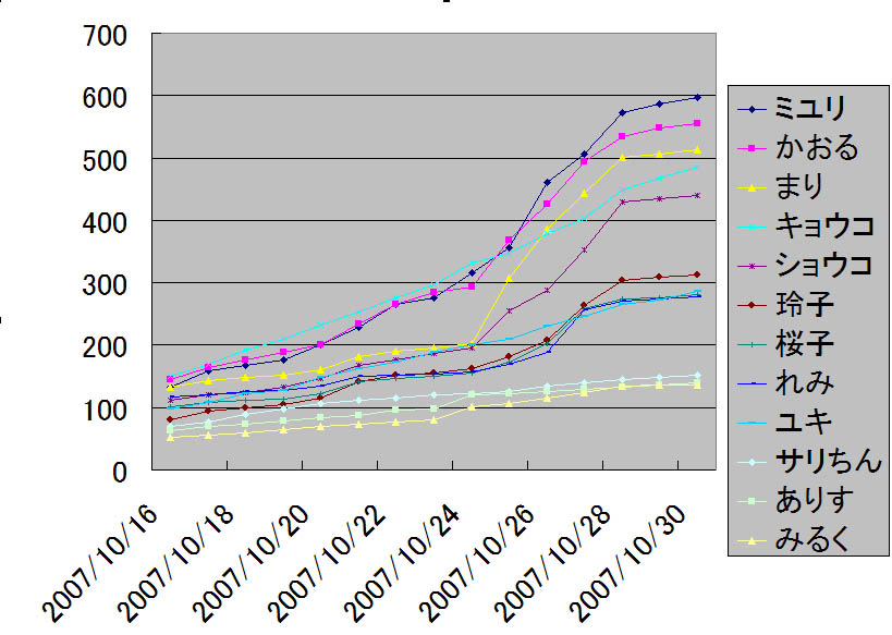 10/28に11位に浮上したみるくでしたが、本日の得票0が響いて再び最下位に転落。